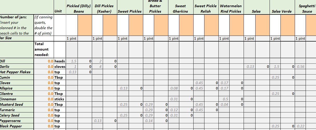 With this tool, you can just enter how many jars of each kind of homemade pickle or other canned good you want, and this tool automatically calculates the amount of herbs/spices you’ll need for your recipes. Super easy and convenient!