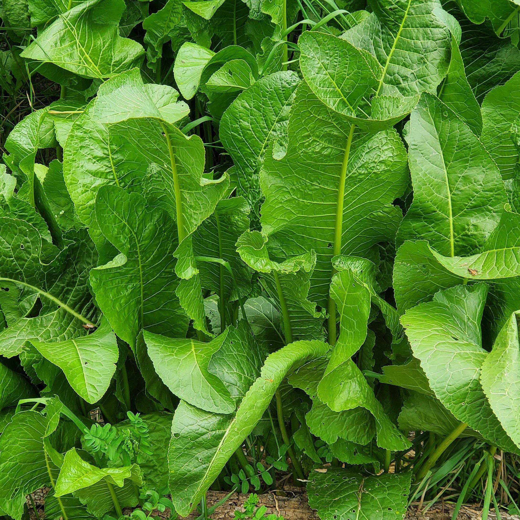 Harvest: Horseradish is typically harvested in late fall, after the first frost, which helps to mellow the root’s flavor and enhances its pungency. To harvest, carefully dig around the base of the plant to avoid damaging the roots, then pull out the large, thick roots that have developed underground. The main root is usually the largest and most flavorful, but smaller side roots can also be collected. After harvesting, the roots should be cleaned thoroughly to remove soil but left unwashed until ready for use or storage to prolong freshness. Properly harvested and stored horseradish roots can last several months in a cool, dark place or refrigerated environment. The leaves can also be used to add a spicy flavor to salads and other dishes.