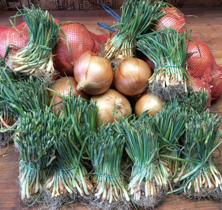 Harvesting: When the tops of onion plants turn brown or yellow and fall over, onions are ready to harvest. Pull (do not dig) early in the morning on a sunny day. Dry the onions in the sun for a few days, then cure in a cool, dry, well-ventilated place until entire neck is dry, skin appears uniform, and skin doesn’t slide when pinched. Clip roots and cut tops before storage.