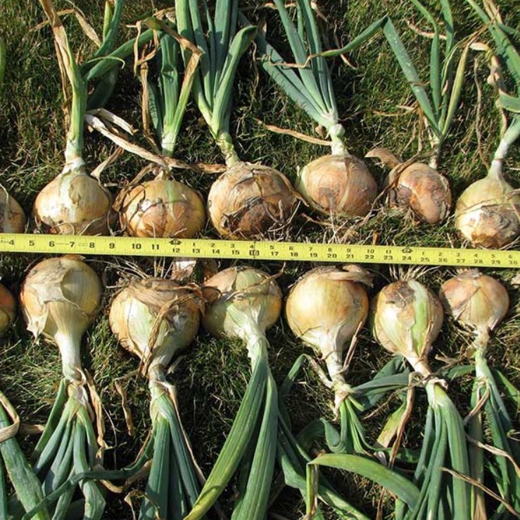 Harvesting: When the tops of onion plants turn brown or yellow and fall over, onions are ready to harvest. Pull (do not dig) early in the morning on a sunny day. Dry the onions in the sun for a few days, then cure in a cool, dry, well-ventilated place until entire neck is dry, skin appears uniform, and skin doesn’t slide when pinched. Clip roots and cut tops before storage.
