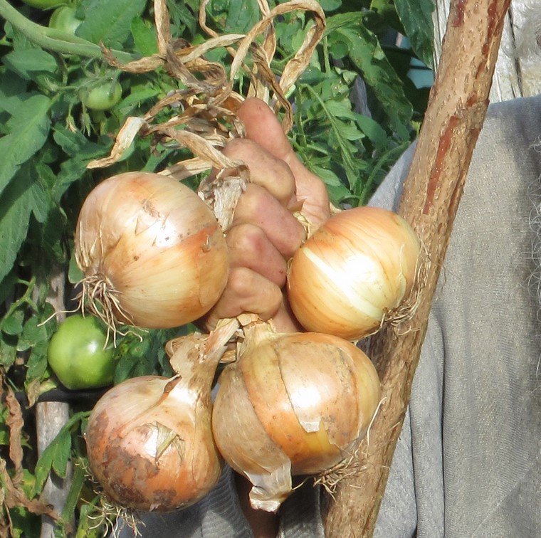 Harvesting: When the tops of onion plants turn brown or yellow and fall over, onions are ready to harvest. Pull (do not dig) early in the morning on a sunny day. Dry the onions in the sun for a few days, then cure in a cool, dry, well-ventilated place until entire neck is dry, skin appears uniform, and skin doesn’t slide when pinched. Clip roots and cut tops before storage.