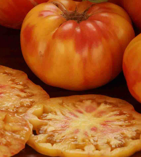 Indeterminate from Polk County, Minnesota. Produces large (2lbs!) orange tomatoes with red marbling throughout the fruit. Gold on the shoulders and red on the other end of the fruit. Sweet, mild flavor. Resistant to foliar disease and doesn’t crack either!