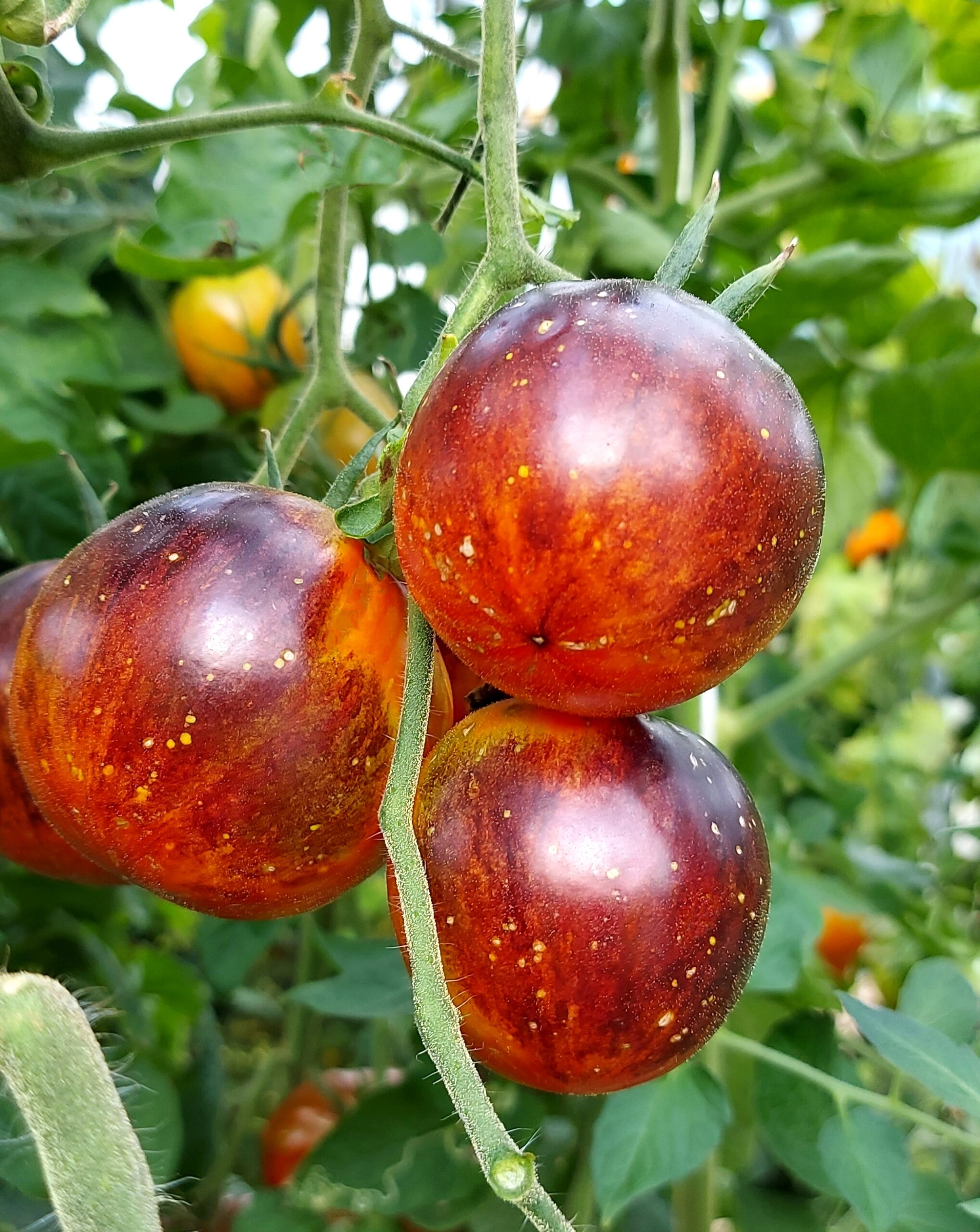Rare tomato variety that produces darkly striped red and black tomatoes peppered with specks of gold/orange.